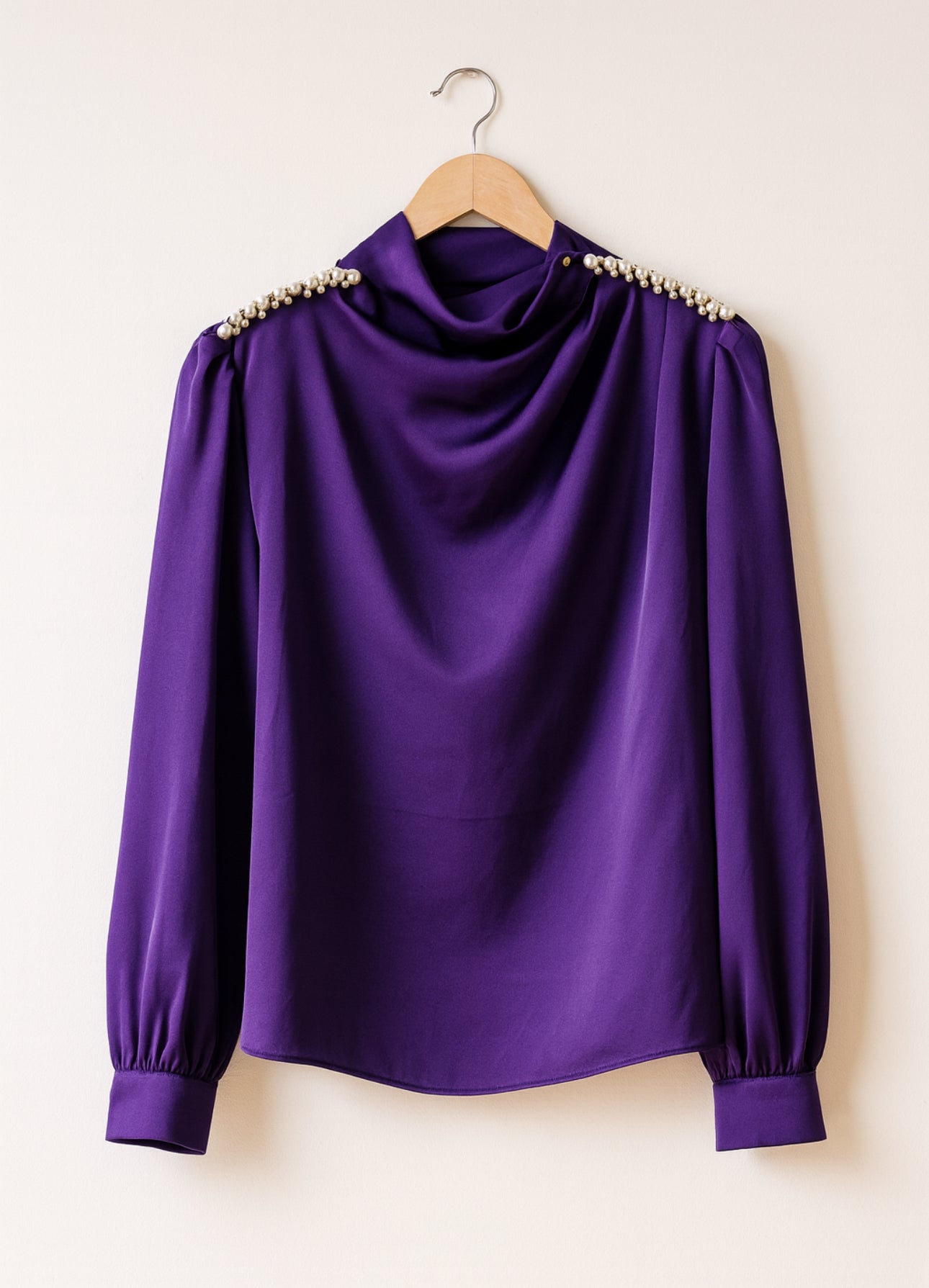 O bluză elegantă, realizată din satin fin, cu un căzut superb și detalii rafinate. Umerii împodobiți cu perle conferă un aer sofisticat, perfect pentru ținute de seară, evenimente sau ocazii speciale. Croiala lejeră și gulerul drapat pun în valoare orice siluetă, oferind un look modern și feminin.