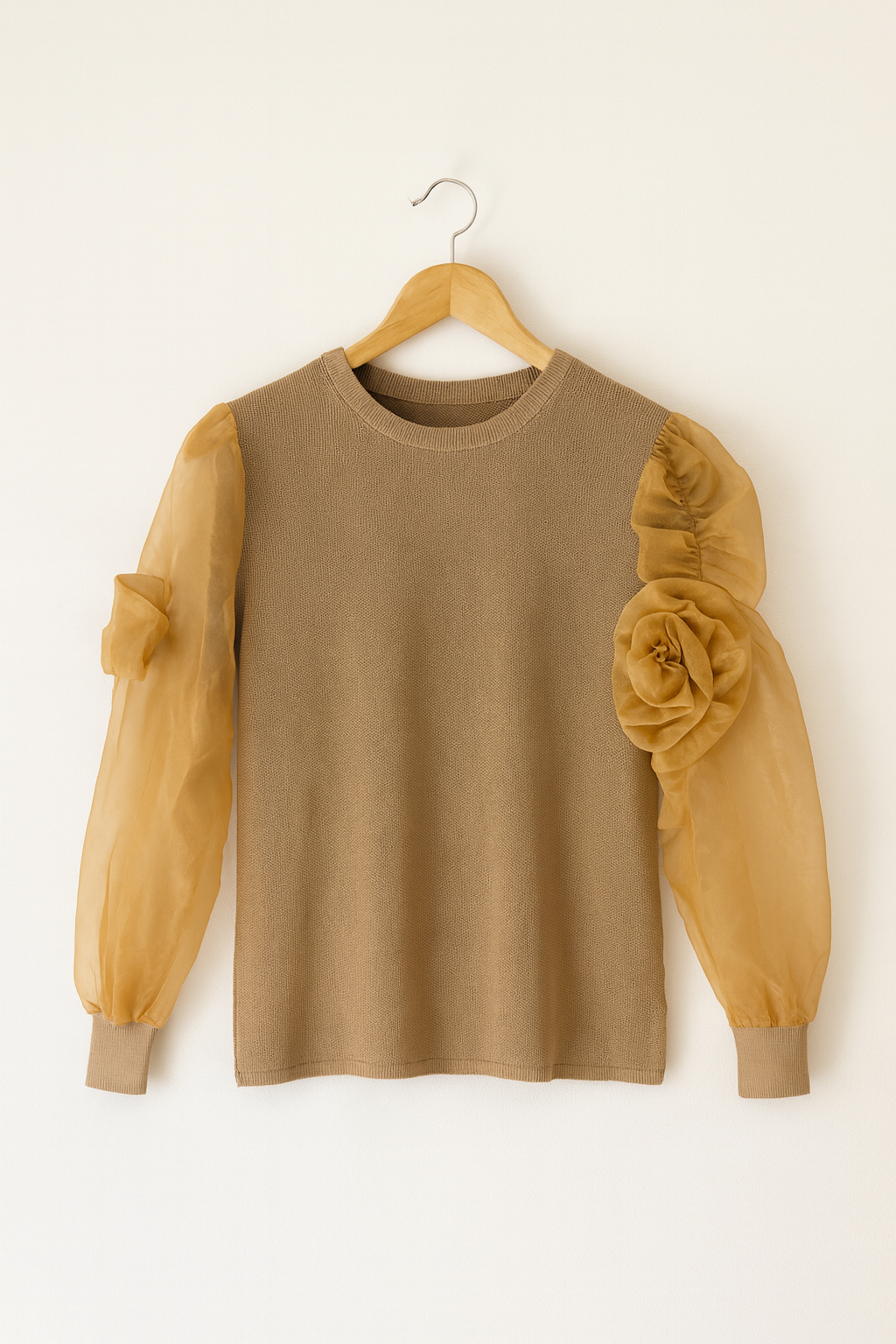 Bluză elegantă cu mâneci bufante din voal și aplicație florală, perfectă pentru ținute feminine, rafinate și ușor de asortat.