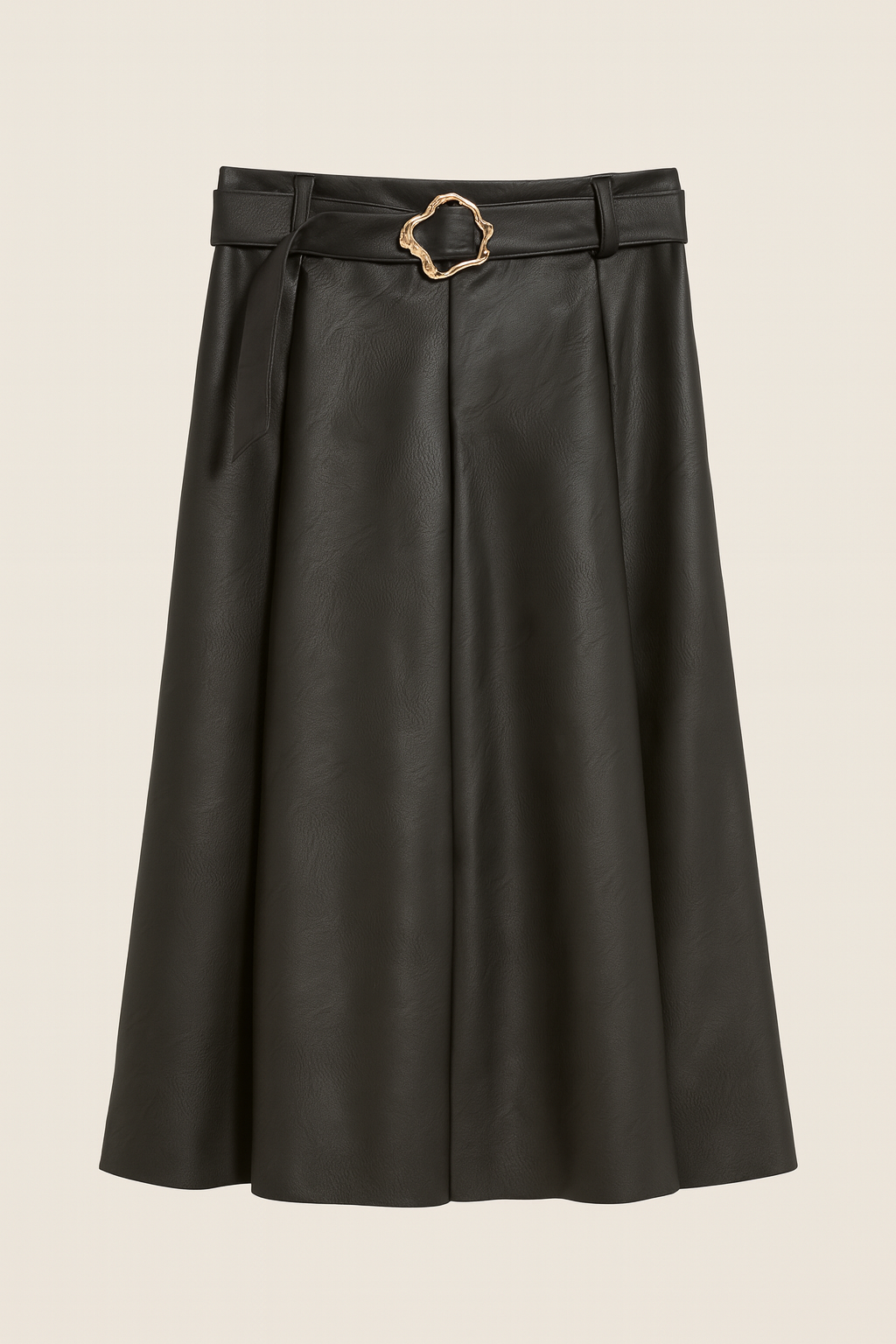 Fustă midi din piele ecologică premium, cu croială amplă și cădere impecabilă. Modelul este accesorizat cu o curea subțire și cataramă aurie cu formă organică, care conturează frumos talia și adaugă un plus de eleganță. O piesă versatilă, perfectă atât pentru ținute office, cât și pentru look-uri chic de zi.
