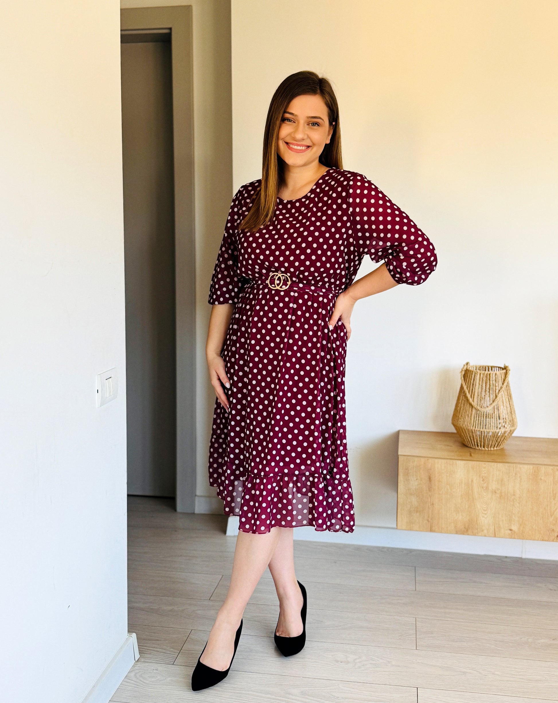 Rochie midi cu imprimeu clasic cu buline albe, realizată dintr-un material ușor și vaporos. Mânecele 3/4 adaugă lejeritate, iar croiala fluidă oferă confort pe tot parcursul zilei. Talia este evidențiată printr-o curea decorativă, care conturează frumos silueta. Un model feminin, versatil și ideal pentru ținute casual-chic sau office.