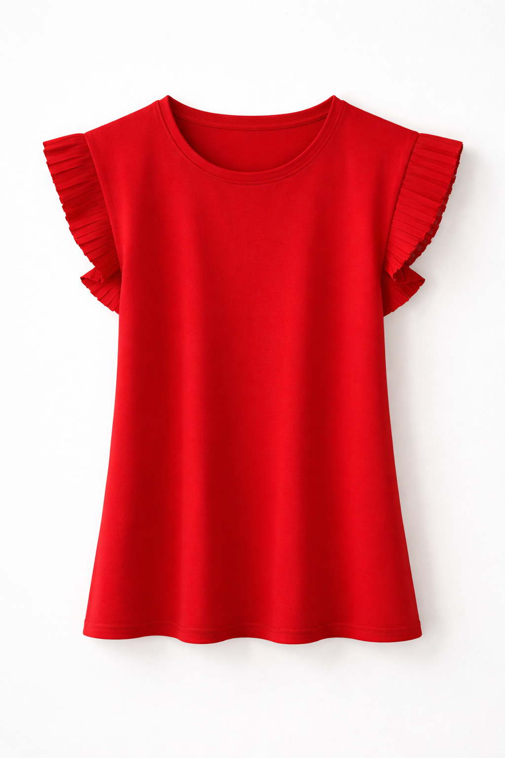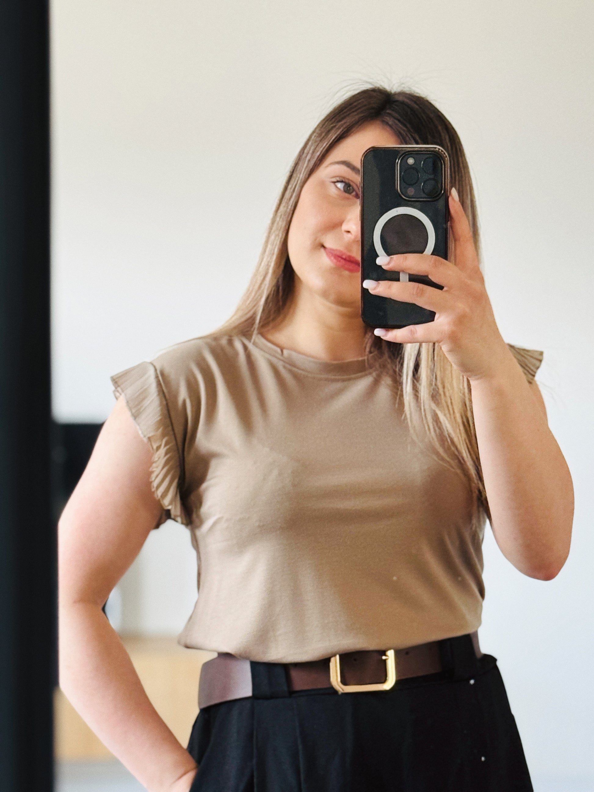 Top feminin cu croială lejeră, evidențiat prin mânecile cu volane plisate, care adaugă un plus de eleganță și rafinament. Designul este simplu și versatil, ușor de integrat în orice ținută.